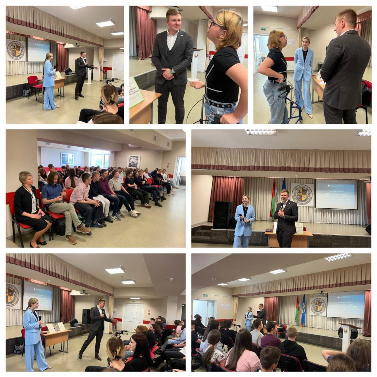 31 мая для учащихся 1 курса организована диалоговая площадка «Мир и созидание в системе ценностей современной молодежи». Спикерами стали председатель Молодежного совета (парламента) при Национальном собрании Республики Беларусь Никита Рачиловский и председатель комиссии Молодежного парламента по международным делам Алина Ретькова .