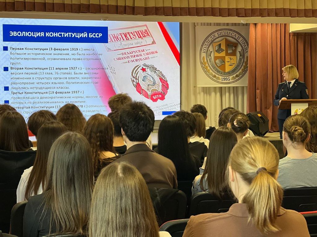 Накануне одного из главных государственных праздников страны — Дня Конституции Республики Беларусь в колледже состоялась встреча со старшим прокурором отдела по надзору за исполнением законодательства о несовершеннолетних и молодежи прокуратуры города Минска Грецкой А.С.