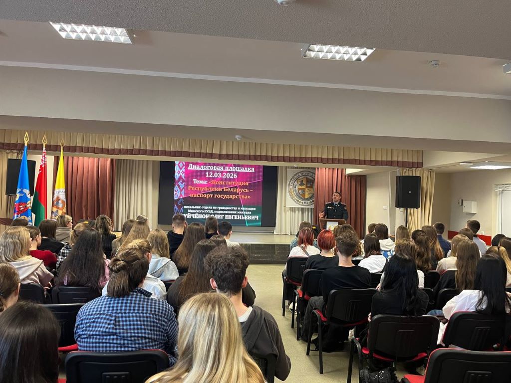 В актовом зале колледжа выступил начальник отдела по гражданству и миграции Минского РУВД, подполковник милиции Буйчёнок О.Е. Состоялся разговор о простых истинах, прописанных в главном законе государства — Конституции.