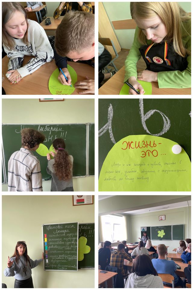 Далее куратор предложила учащимся составить «цветок жизни», где написать ассоциации каждого учащегося со словом «жизнь». Также рассматривались, что может сделать человек, когда ничего не радует, когда мир за окном меняет свои краски, когда преобладают негативные эмоции? Были предложены естественные методы, помогающие всё это изменить, не замечать: вкусная еда, общение с близкими, отдых, хорошие отметки, животные, антистрессы и т.д. Но было озвучено и об искусственных методах (алкоголь, наркотические вещества, антидепрессанты), которые не помогают и не помогут решить ни одну проблему!