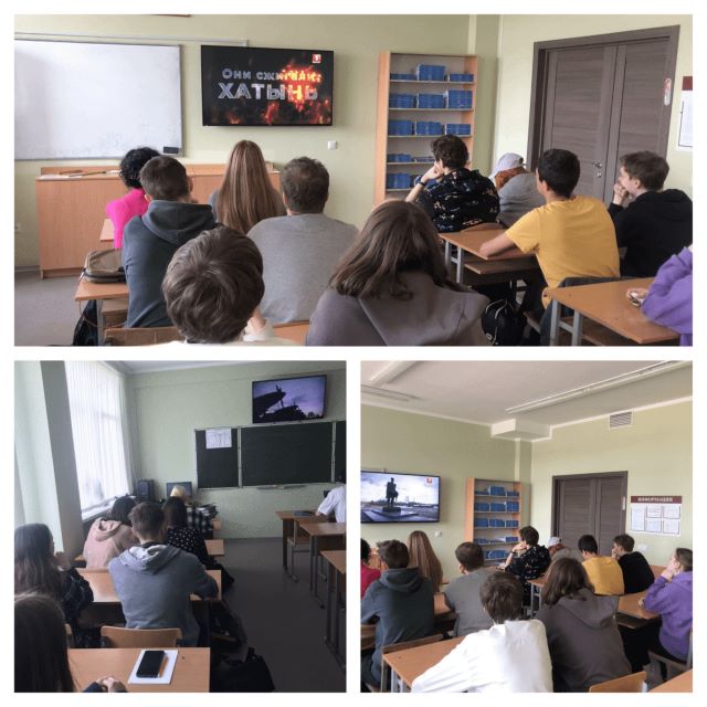 В рамках акции «30 дней до Победы» в учебных группах Т-191, Д-191, Т-096 прошли кураторские часы с просмотром и дальнейшим обсуждением документального фильма «Они сжигали Хатынь» о зверствах фашистских захватчиков.