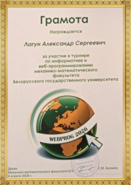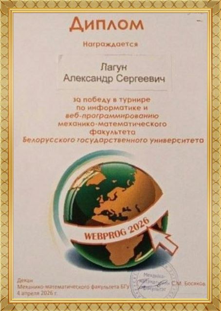 🏆 Лагун Александр награждён Дипломом победителя и ценным призом за продемонстрированные глубокие знания в области современных веб-технологий.